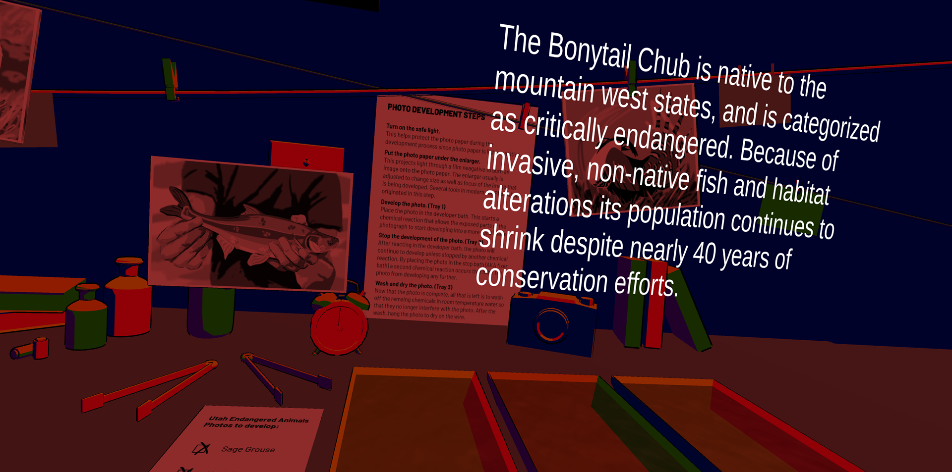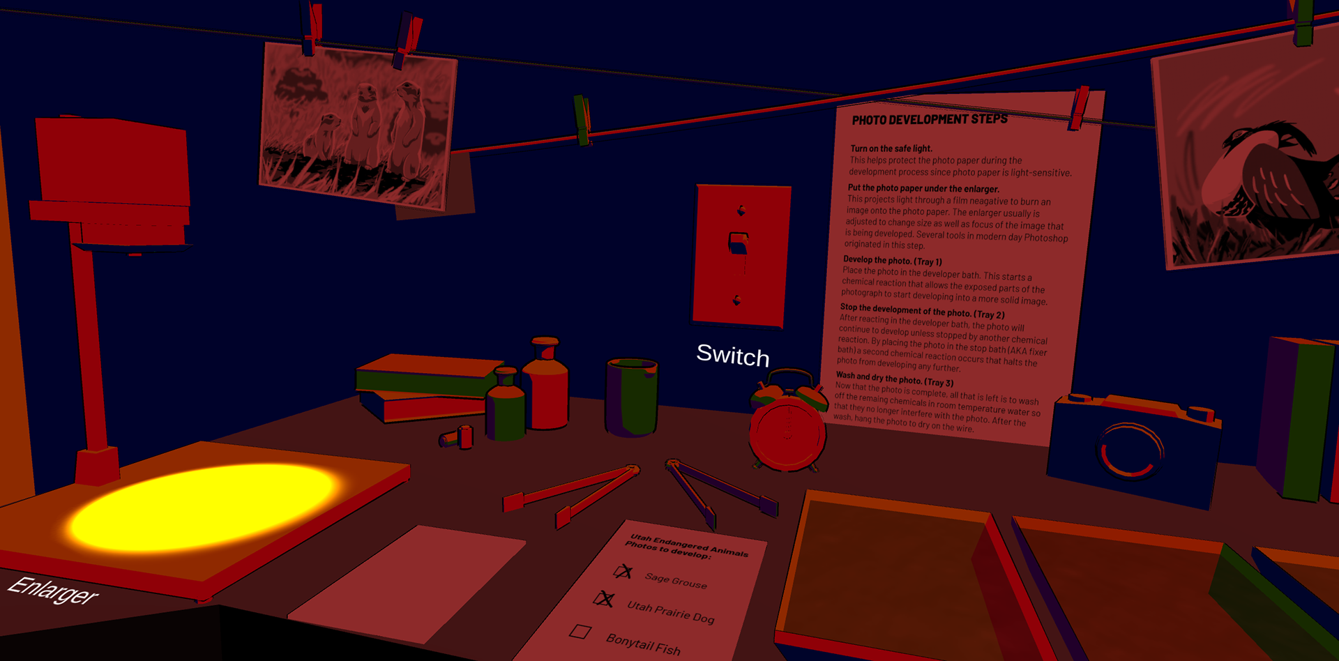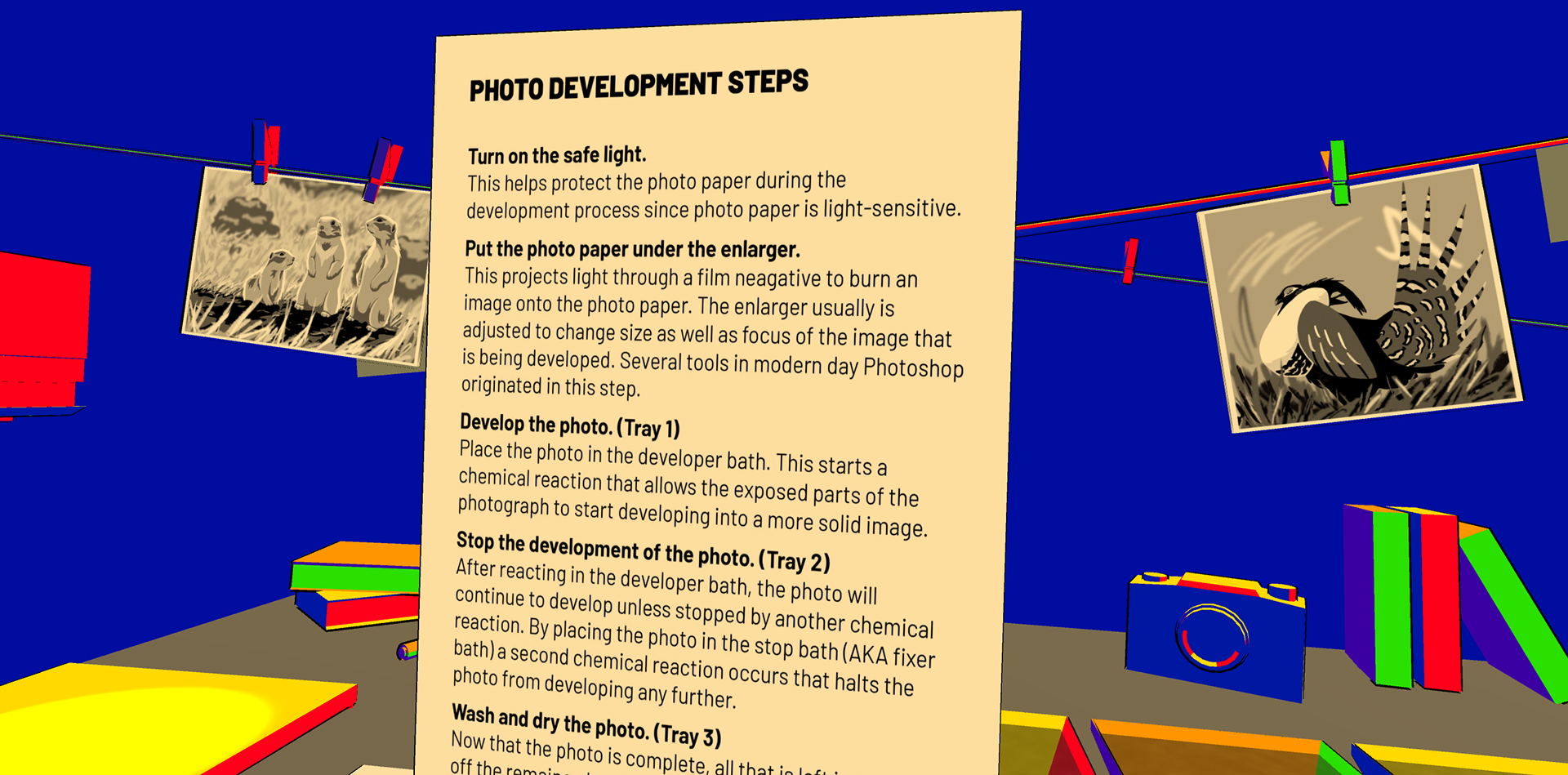 Learn to develop photos in a traditional dark room setting and watch a story develop before your very eyes. Inspired by the Modernism art movement, this is an educational VR-like game where players go through the various steps to develop photos using analog methods. Developed by a team of six graduate students using Unity over the course of 14 days.